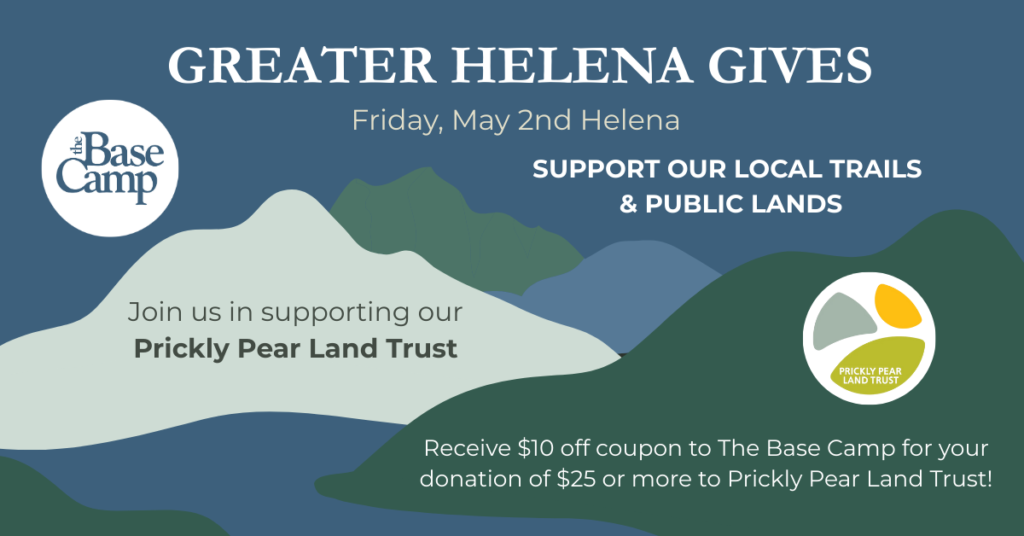 Join us at The Base Camp for Greater Helena Gives—a one-day celebration of community, connection, and conservation. We’re proud to support the incredible work of Prickly Pear Land Trust, an organization dedicated to protecting open space, building trails, and enriching the quality of life in the Helena area.